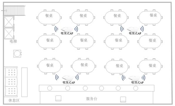 酒店餐廳相對空曠,阻隔物較少,可根據(jù)餐廳規(guī)模及吸頂式AP覆蓋范圍酌情部署,布點點位均勻分布,如下圖所示: