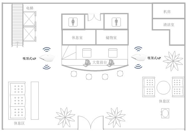 大堂相對空曠,阻隔物較少,吸頂式AP在空曠環(huán)境中覆蓋直徑20米,中小型酒店大堂可根據(jù)具體結構布置2-3個AP即可,大型酒店大堂可酌情增加,如下圖所示: