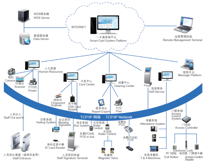 系統以一卡通管理系統為核心,通過網絡連接各功能模塊構成系統的基本框架,由于系統按模塊設計,可根據管理和發展的需要量體裁衣,分步實施,任意增減功能和擴充規模。
